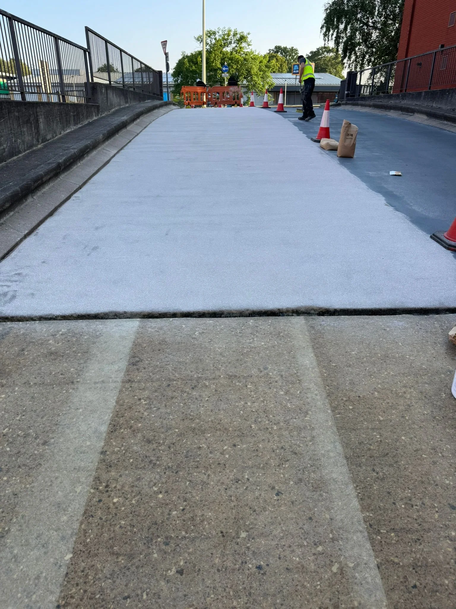Initial concrete repairs to the deck were carried out using Sika MonoTop 630 Rapid. The Sikafloor system comprised a priming coat of Sikafloor 10 Pronto N followed by an embedment coat of Sikafloor 32 Pronto incorporating Sika Reemat Premium as a reinforcement layer. Two further coats of Sikafloor 32 Pronto were applied and broadcast with kiln dried quartz sand to act as a waterproof wearing layer. Two coats of Sikafloor 18 Pronto were then applied as the finish colour. Finally, the line markings were reinstalled using a chlorinated rubber coating.